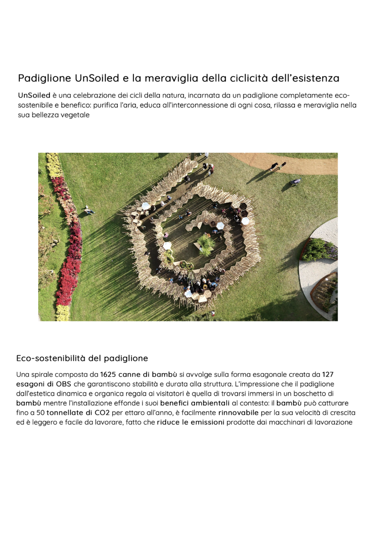 Presented at Orticolario 2024, set in the dreamlike scenery of Villa Erba on Lake Como, the UnSoiled Pavilion is one of the outdoor projects by the young and brilliant Como-based uau studio. A tactile and concentric path, composed of a vibrant bamboo grove, guides visitors through the stages of plant life: from the nourishment drawn from the soil, to the plant’s fullest expression in bloom, and finally to decomposition as a transformation into new life.